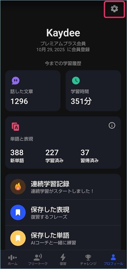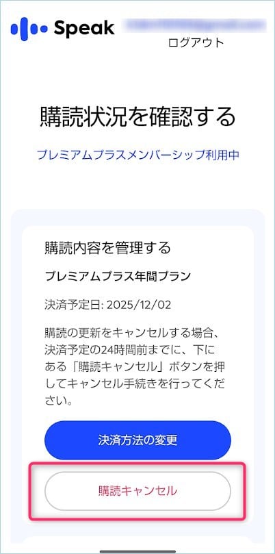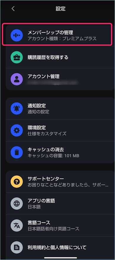 Web決済の場合は、スピークアプリ内の「プロフィール」>「設定(歯車マーク)」>「メンバーシップの管理」から解約キャンセルを選択します。