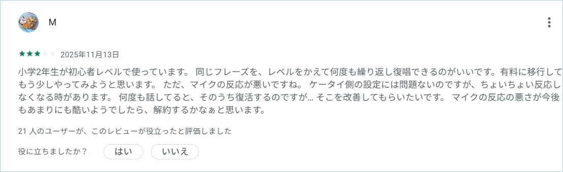 - 発話時に、アプリの音声認識が遅い時がある。マイクの不具合なのかアプリの遅延なのかわからず、何回も発話し直す時がある
