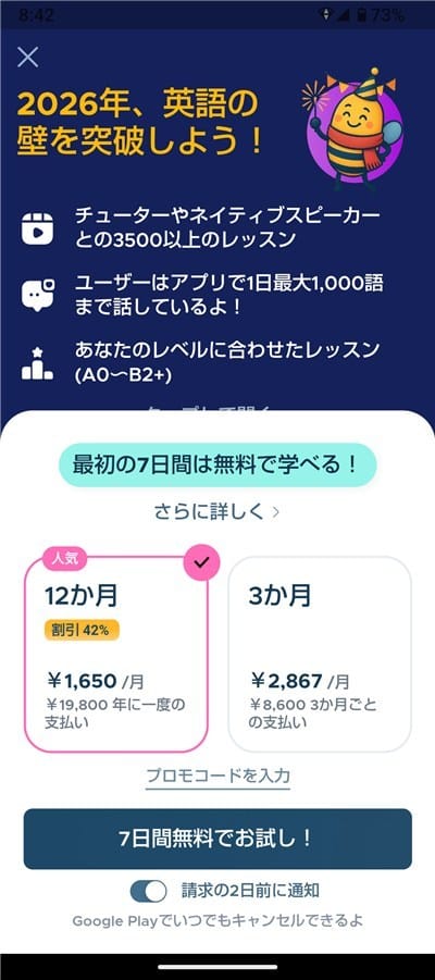 7日間の無料トライアル申し込み時に、3か月または1年のサブスクリプションプランを選んで体験スタートとなります。