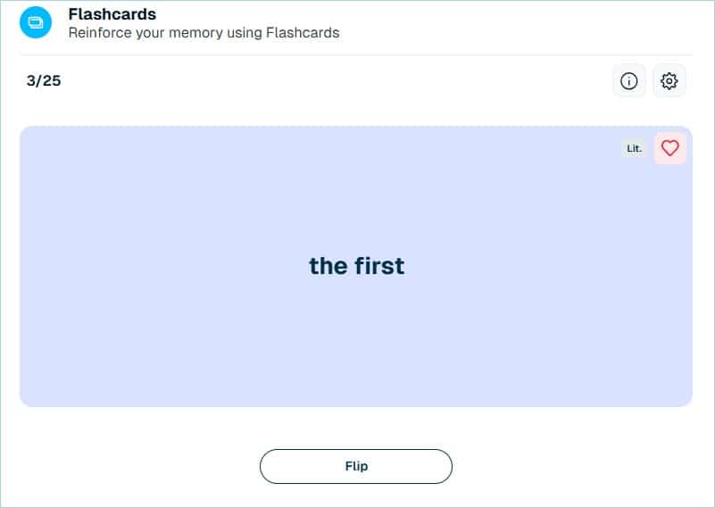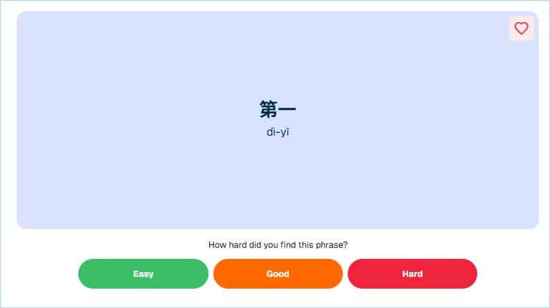レベル毎に設定された単語がフラッシュカードとして画面に表示されます。フリップして答え合わせをし、その単語のレベルが簡単だったら(Easy)、適切だったら(Good)、難しかったら(Hard)を選択して次に進みます。回答結果に応じて次回のフラッシュカードの難易度が調整されます。